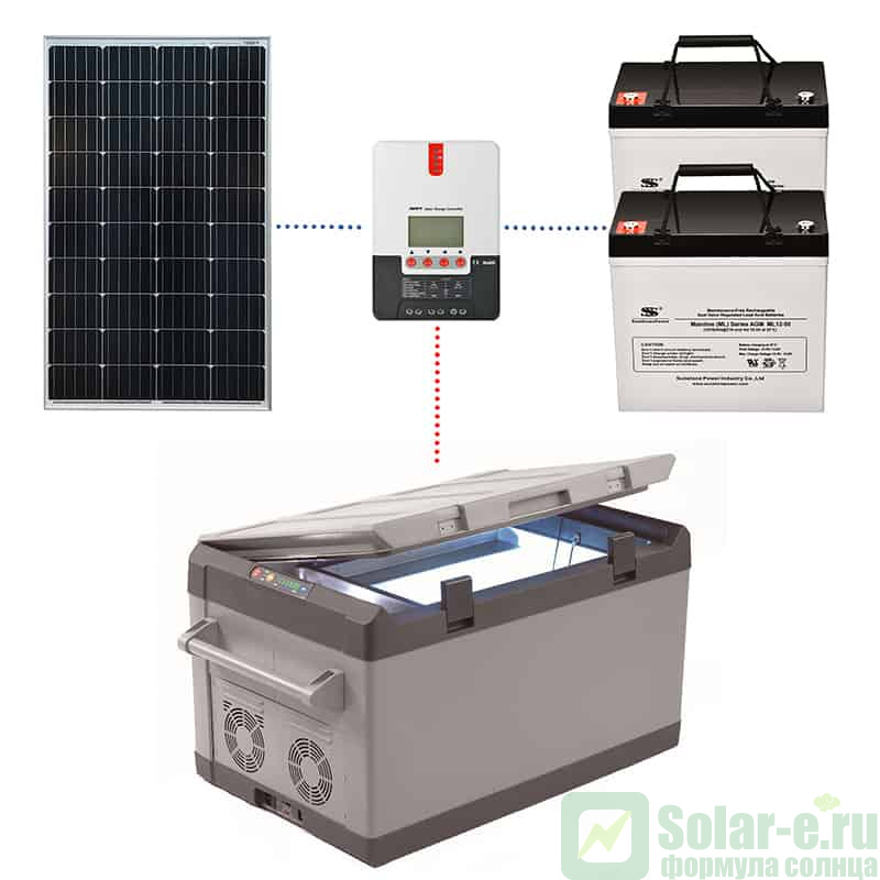 Готовое решение для обеспечения круглосуточного электропитания холодильника с напряжением 12 вольт и энергопотреблением до 50Вт/час. Это надежный, экологически чистый и тихий источник электроэнергии.
